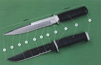 - Лезвие. Бывает остром, зубчатым, пильчатым, а также прямым, изогнутым, длинным или коротким.