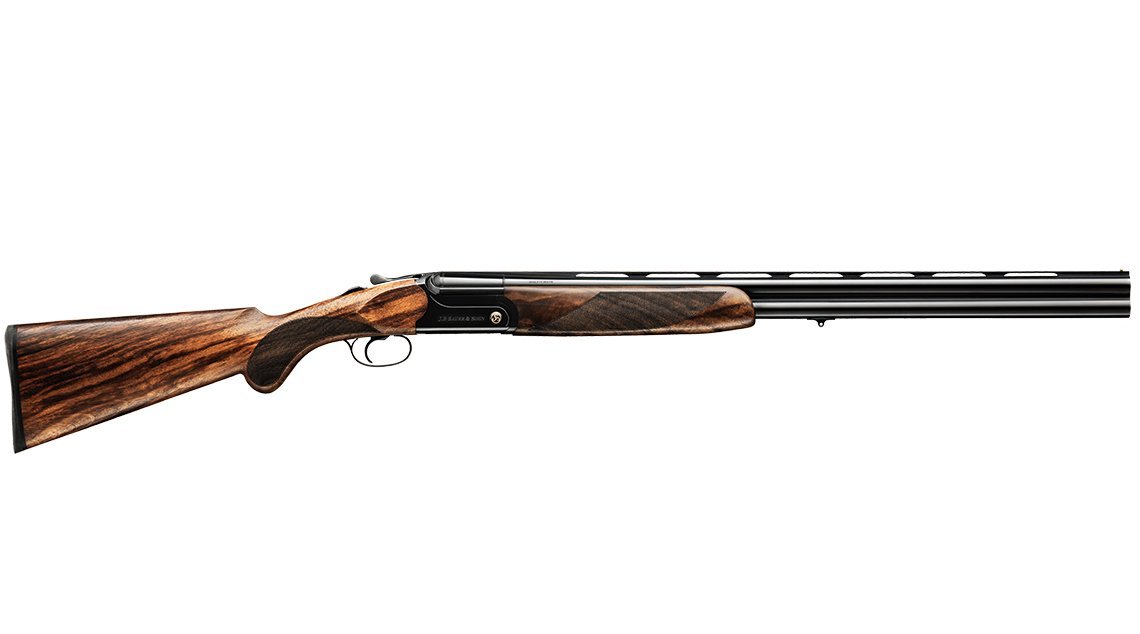 Вертикальное двуствольное ружье 12 калибра от Sauer. Оружие имеет черную ствольную коробку с гравировкой "Sauer & Sohn". Приклад и цевьё - из тёмного ореха.