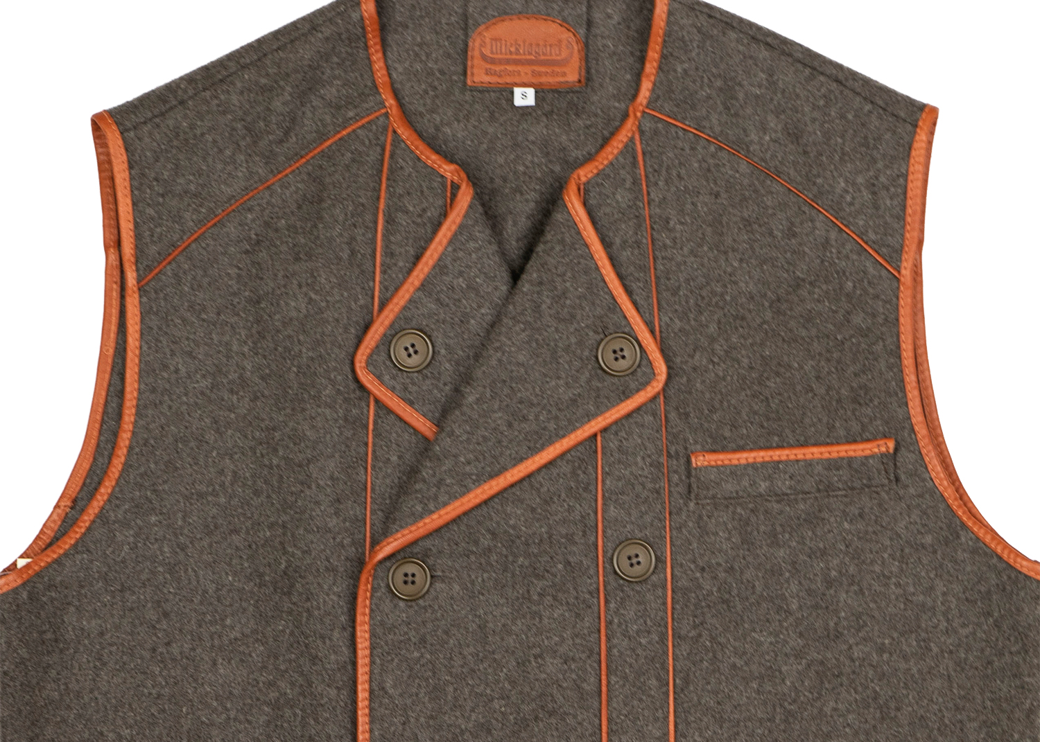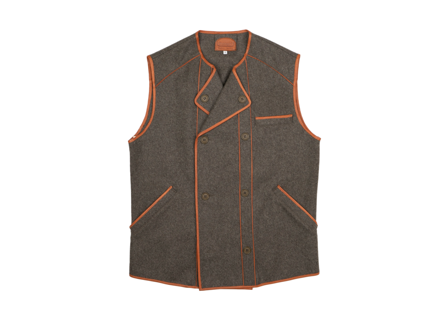 Двухбортный шерстяной жилет с кожанной отделкой. Два боковых и один нагрудный карман.